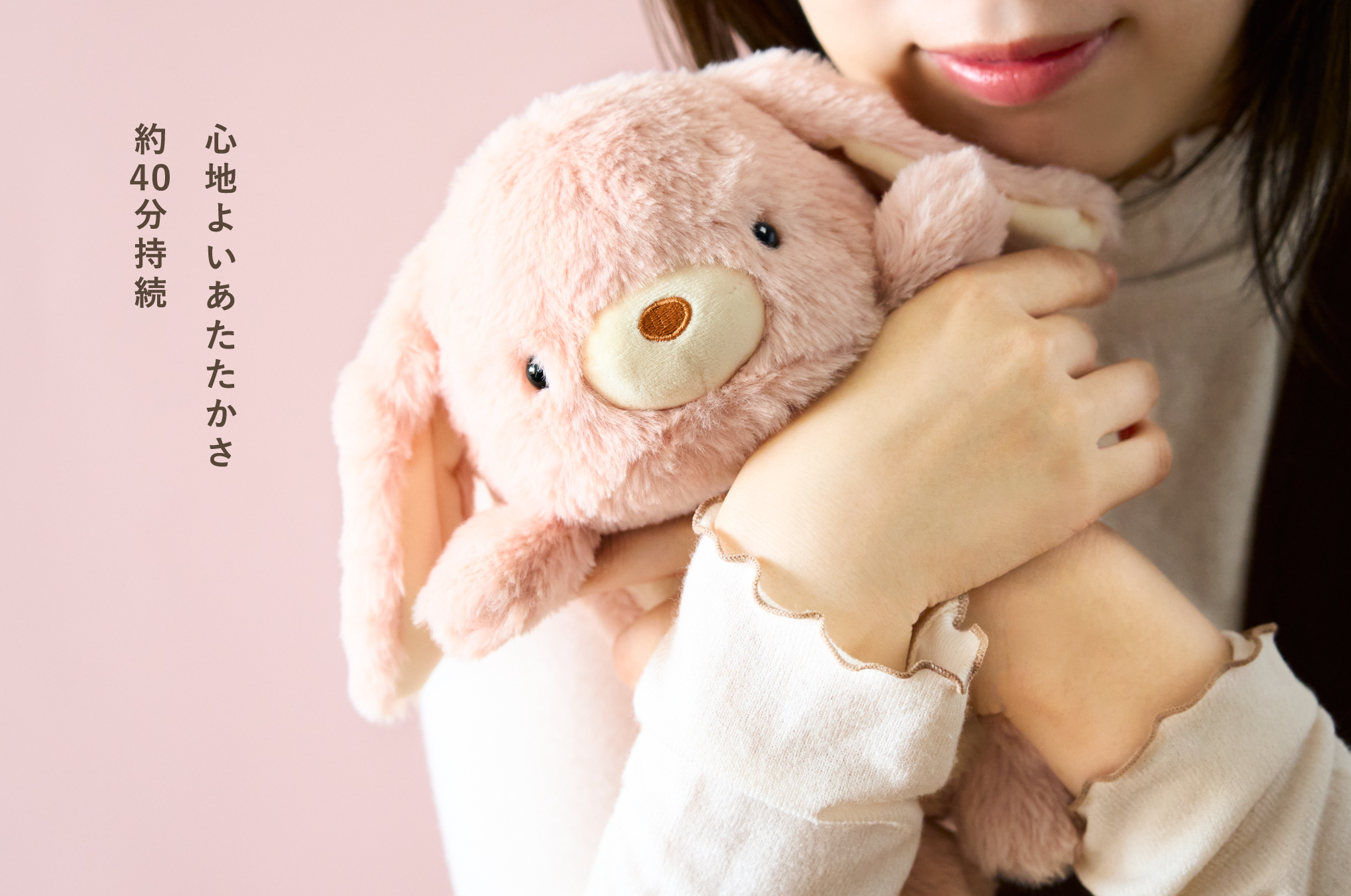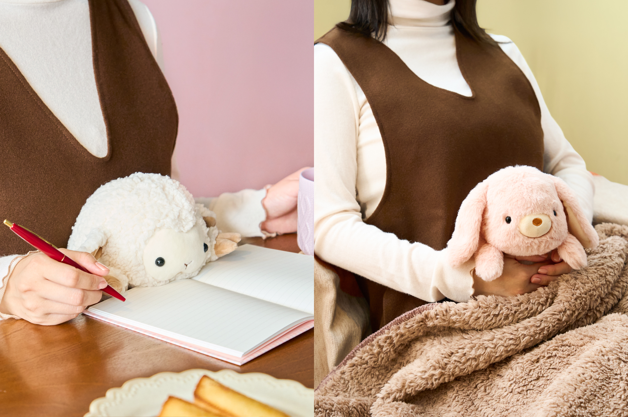 ふわふわでつい撫でたくなる大きい耳が特徴的な「ロップイヤーラビット」と、昨年よりさらに心地よい手触りになった「ヒツジ」の2種がラインナップ。デスクワークや勉強中には、姿勢を支えながらお腹をじんわり温めてくれる頼れる相棒として、リラックスタイムには、抱きしめるだけで心も体もほっと癒される温活アイテムとして活躍します。癖になってしまう柔らかい触り心地と温もりで、寒い時期のあなたの姿勢とこころをおたすけします。