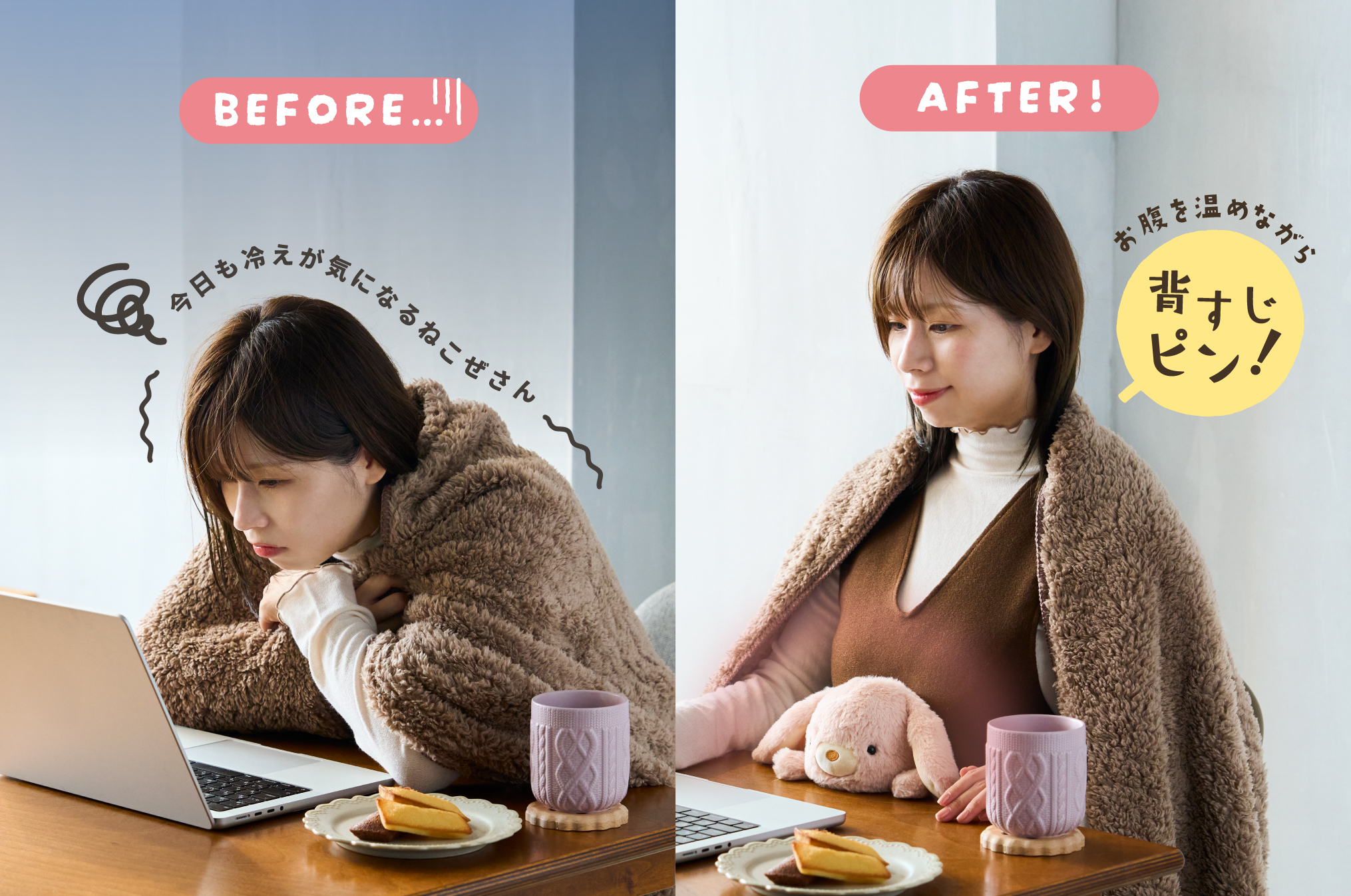 「ふんばるず」を落とさないよう、机とおなかの間にしっかり挟み込むため、自然と背筋が伸び良い姿勢に。つい“猫背”になってしまうあなたも、シャキッとした背筋に早変わり。さらに『ふんばるず ウォーマー』は、身体を温めることができるので、姿勢改善も温活もできる一石二鳥のアイテムになっています。
