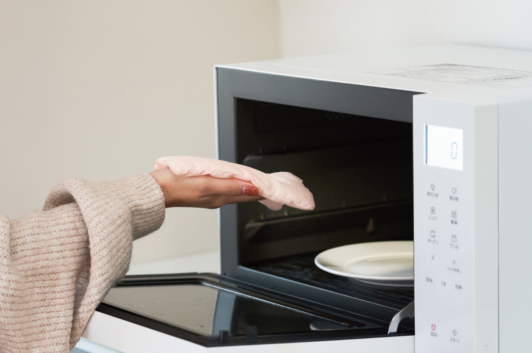 ビーズ袋を電子レンジ(500Wで30秒)で温め、ふんばるずウォーマーの背中に入れてください。