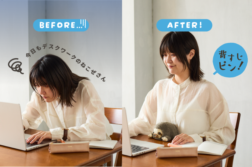 「ふんばるず」を落とさないよう、机とおなかの間にしっかり挟み込むため、自然と背筋が伸び、良い姿勢に。つい“猫背”になってしまうあなたも、シャキッとした背筋に早変わり。2026年も仕事や勉強を頑張る“猫背”なあなたをサポートしてくれます。