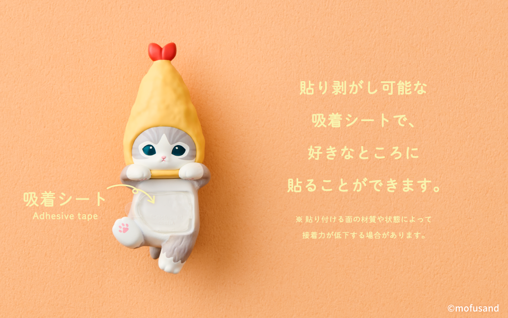 2024年9月に発売し、大好評だった「HIPPERS mofusand」の第2弾が登場。サクサクな衣の形が特徴的なエビフライやぷりっとした甘えびなど、「えび」のコスチュームを身にまとった全7種類がラインナップ。前からはちょこんと顔をのぞかせる姿や、後ろからはぽてっとしたおしりと尻尾を楽しむことができます。ちょっぴりシュールでとっても可愛いにゃんこたちが、いつもの日常に、彩りを添えてくれます。